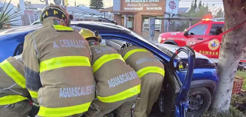 Una mujer termina atrapada dentro de la cabina de su propio automóvil, luego de impactarse contra un árbol, al perder el control del volante de su vehículo, un Renault en color azúl con placas de Aguascalientes.