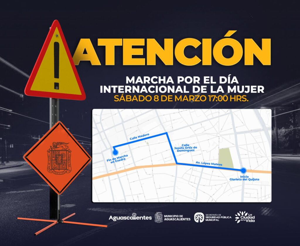 La secretaría de Seguridad Pública y Vialidad, informó que ante el evento de este sábado, previo a comenzar la Marcha #8M en Aguascalientes, se darán cierres estratégicos de calles aledañas para seguridad de las manifestantes a lo largo de su camino.