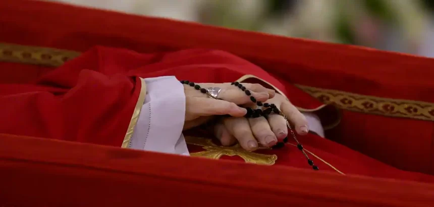 El papa descansa sobre un féretro de madera forrado de terciopelo rojo con una casulla purpura y una mitra blanca y en las manos lleva un rosario.