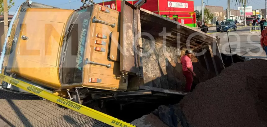 La mañana de este jueves, un socavón de más de 10 metros de largo por 3 de ancho se tragó un camión de volteo cargado con 10 toneladas de arena en el Blvd. Guadalupano, justo en la entrada a La Florida, zona por donde diariamente circulan autos particulares y camiones de pasajeros.
