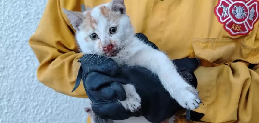 Un gatito fue rescatado por bomberos luego de quedar atrapado en una máquina de cobro dentro del Hospital Star Médica en Aguascalientes.