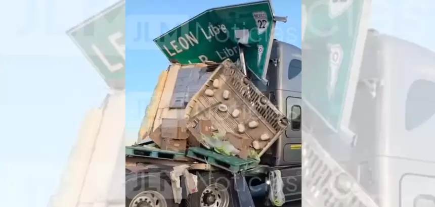 Protección Civil de Rincón de Romos confirma que el tráiler se impactó contra un señalamiento vial tipo, causando qué la caja seca quedara destrozada y causando cierre parcial de la circulación de sur a norte.